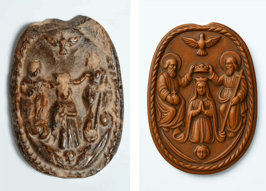 O medalhão encontrado retratava uma imagem rara para o “sertão goiano” mas que já poderia ser conhecida por algum tropeiro ou bandeirante conforme podemos ver acima uma pintura do século XVIII e que pode ter sido moldada de forma iconográfica em um medalhão de terracota e que foi parar ali para que sua mensagem profundamente teológica fosse enraizada nos corações: a Santíssima Trindade coroando Maria Santíssima. Não era uma representação comum para o Goiano-Mineiro. Ali, o Pai Eterno (Deus), o Filho (Jesus Cristo) e o Espírito Santo estavam visivelmente unidos na glória, coroando a Mãe do Salvador como Rainha do Céu e da Terra. Esse achado, marcado por sua singularidade e beleza, foi o ponto inaugural de uma devoção que, com o tempo, transcenderia o objeto e se tornaria caminho espiritual para milhões.